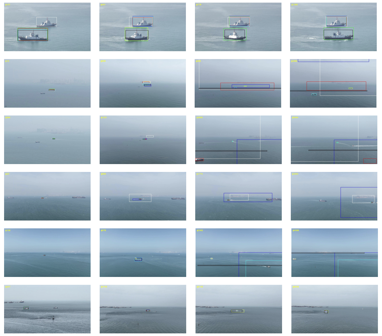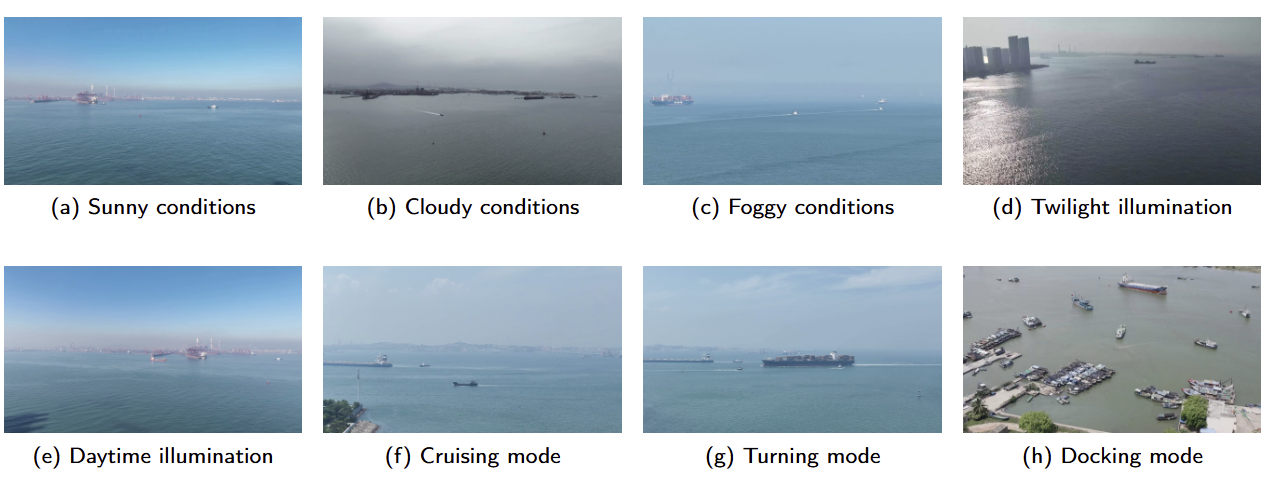 Eight sequence examples contained in UAVSeaShip102, captured under different weather conditions, illuminations and motion patterns.