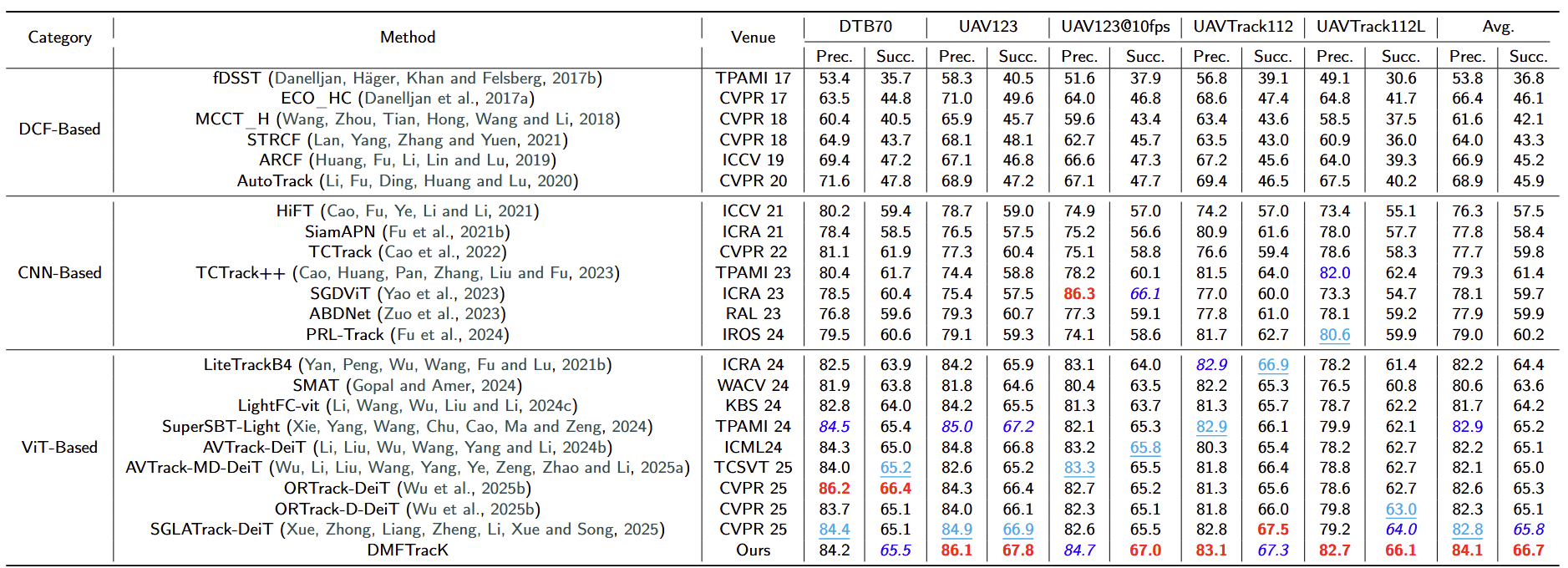 Comparison between our method and 22 state-of-the-art lightweight trackers in terms of the precision and Success Rate metrics on the test sets of DTB70, UAV123, UAV123@10fps, UAVTrack112 and UAVTrack112L. In addition, the average metric values computed across the five data sets are presented in the column of “Avg.”. Here, the top three results derived in each case are highlighted in the red, blue and cyan fonts, respectively.